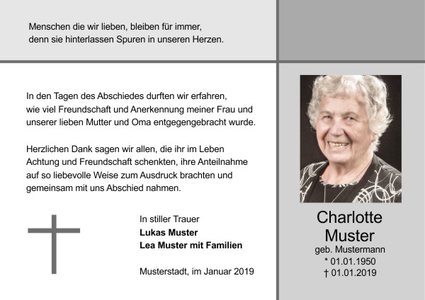 Bei einem Trauerfall und Beerdigung bedarf es nicht unbedingt vieler gesprochener Worte. Drücken Sie mit unseren Trauerdanksagungen Ihr Mitgefühl aus. Ihre Mitmenschen werden es Ihnen danken. Nehmen Sie sich die Zeit, die Sie brauchen, um in ihrem Trauertext die richtigen Worte zu finden. Unsere schlichten Trauerfall Dankeskarten können Sie individuell gestalten. Wir bieten Motive mit Blumen, Rosen, Lilien, Calla, Orchideen. Hintergründe mit Sonnenuntergängen, Landschaften, Bergen und den Alpen, aber auch Hintergründe mit religiösen Motiven, Kreuzen, Engeln und Lichtern. Sehr beliebt sind unsere persönlichen Trauerkarten mit Foto oder Kerzen.