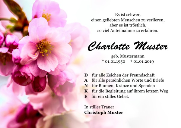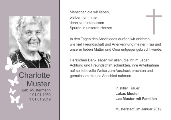 Bei einem Trauerfall und Beerdigung bedarf es nicht unbedingt vieler gesprochener Worte. Drücken Sie mit unseren Trauerdanksagungen Ihr Mitgefühl aus. Ihre Mitmenschen werden es Ihnen danken. Nehmen Sie sich die Zeit, die Sie brauchen, um in ihrem Trauertext die richtigen Worte zu finden. Unsere schlichten Trauerfall Dankeskarten können Sie individuell gestalten. Wir bieten Motive mit Blumen, Rosen, Lilien, Calla, Orchideen. Hintergründe mit Sonnenuntergängen, Landschaften, Bergen und den Alpen, aber auch Hintergründe mit religiösen Motiven, Kreuzen, Engeln und Lichtern. Sehr beliebt sind unsere persönlichen Trauerkarten mit Foto oder Kerzen.