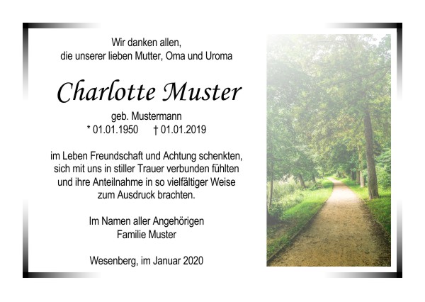 Unsere Trauer Dankeskarten bieten wir in mehreren Formaten an. Auf unserer Homepage finden Sie eine große Auswahl an Danksagungen, die Sie gerne auch mit einem Foto gestalten können. Dadurch wird aus diesen Trauerdanksagungen mehr als nur eine schlichte Dankeskarte, sie bleiben eine wunderbare Erinnerung an einen geliebten Menschen.