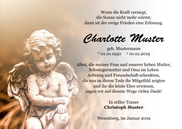 Bei einem Trauerfall und Beerdigung bedarf es nicht unbedingt vieler gesprochener Worte. Drücken Sie mit unseren Trauerdanksagungen Ihr Mitgefühl aus. Ihre Mitmenschen werden es Ihnen danken. Nehmen Sie sich die Zeit, die Sie brauchen, um in ihrem Trauertext die richtigen Worte zu finden. Unsere schlichten Trauerfall Dankeskarten können Sie individuell gestalten. Wir bieten Motive mit Blumen, Rosen, Lilien, Calla, Orchideen. Hintergründe mit Sonnenuntergängen, Landschaften, Bergen und den Alpen, aber auch Hintergründe mit religiösen Motiven, Kreuzen, Engeln und Lichtern. Sehr beliebt sind unsere persönlichen Trauerkarten mit Foto oder Kerzen.